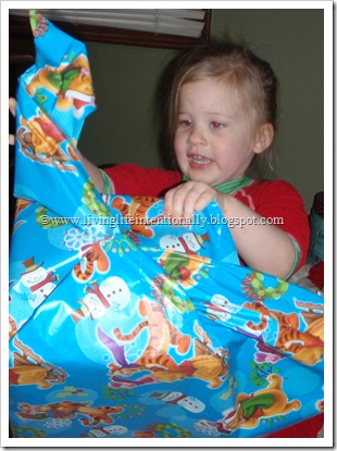 This is a much anticipated activity in our house!! Even grown-ups get a present. These are not big presents – maybe a holiday related item like Christmas socks that by the time you open it on Christmas you can’t use it until the next year, flavored coffee for Dad, snowman stuffed animals from Target dollar section, special ornament reflecting a milestone or new interest (ballerina for Minnie this year since she started taking ballet class), you get the idea. The fun is in the opening!